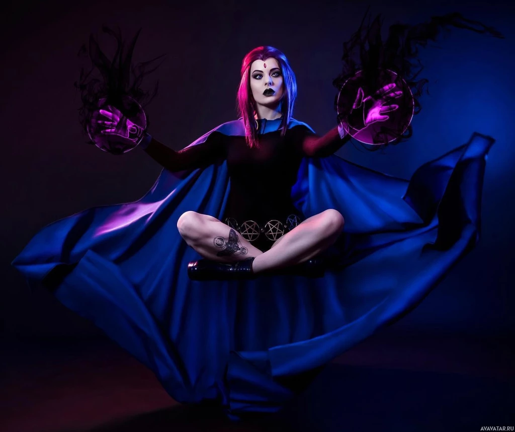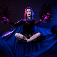 long hair and are wearing dark clothing with blue accents, along with accessories such as a necklace and what appears to be a costume or cape. The setting is dimly lit with