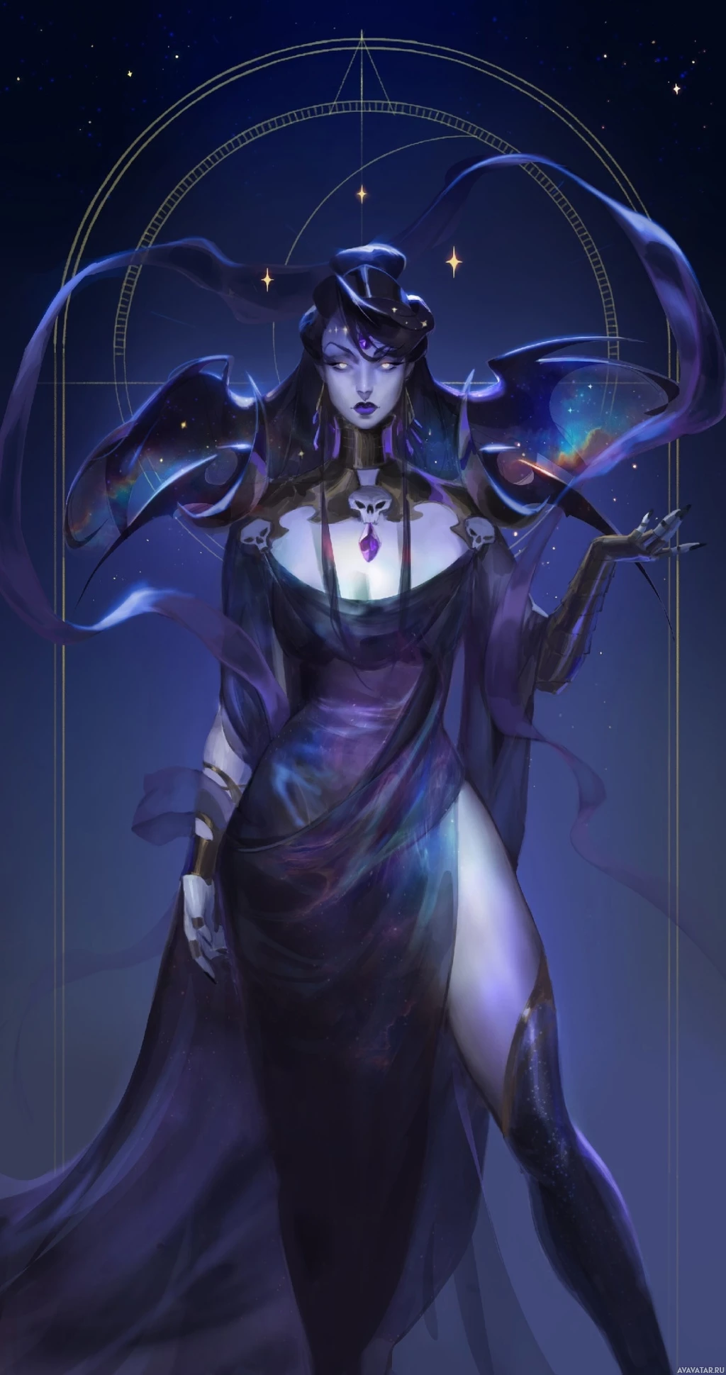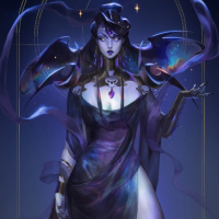 purple hair and is adorned with various decorative elements such as feathers, jewelry, and magical motifs like stars and crescent moons. Her attire seems ethereal and mystical, with a combination of robes or drapery that suggests
