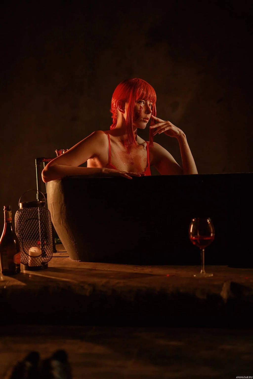 red hair who appears to be in a bathtub. The setting seems somewhat dimly lit, and she is surrounded by various items such as wine bottles,