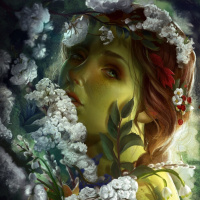 red hair. She is depicted with a floral crown and is surrounded by a variety of flowers, including what appears to be