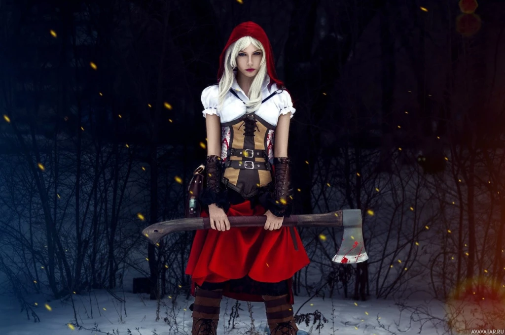 a large axe, which suggests they might be a warrior or huntress of some sort. The setting appears to be outdoors with a forest backdrop, enhanced by the presence of what seems to be magical sparkles or light effects, indicating a scene that is likely part of