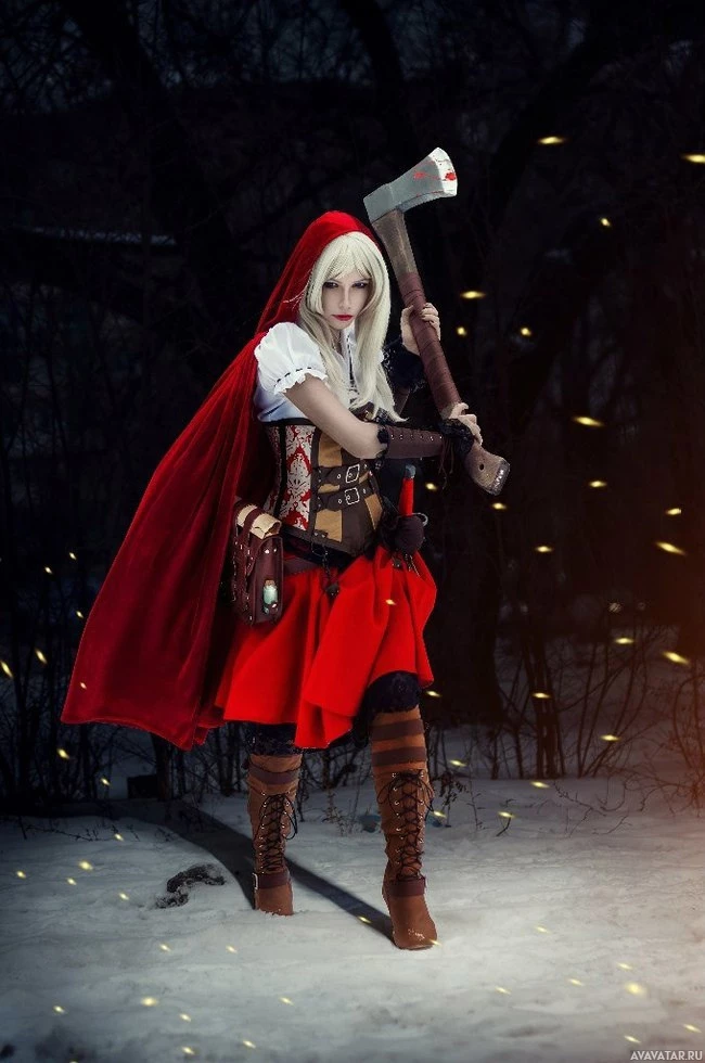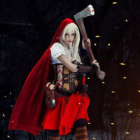 hooded cloak, white wig to represent the traditional story's protagonist, and holding an axe that is likely meant to resemble the iconic tool used by her grandmother to fend off the wolf. The setting appears to be outdoors with trees around, suggesting a forest or woodland environment, which fits well with the theme of