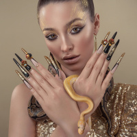 multiple fingers painted gold and is holding out her hands to showcase them. The nails are decorated with snake designs, adding to her