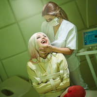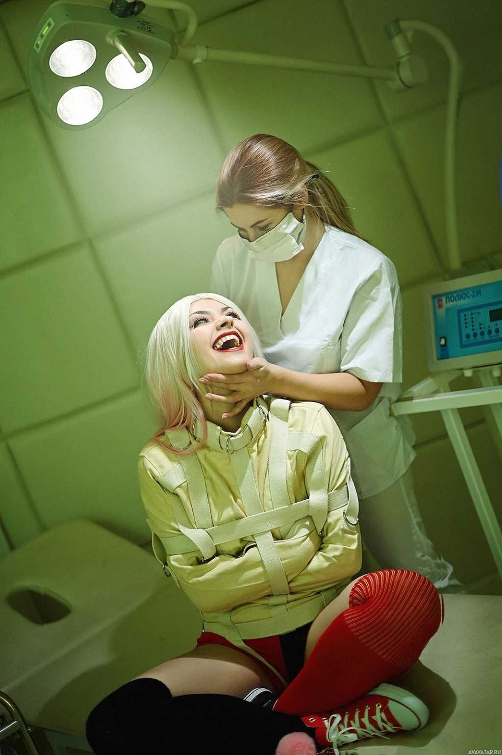 examination table with straps on her arms and legs, suggesting that she might be in a hospital or medical setting. Another woman, presumably a nurse based on her uniform, is standing over her, holding a stethoscope to Harley Quinn's chest, which adds to the medical context of the scene. The presence of