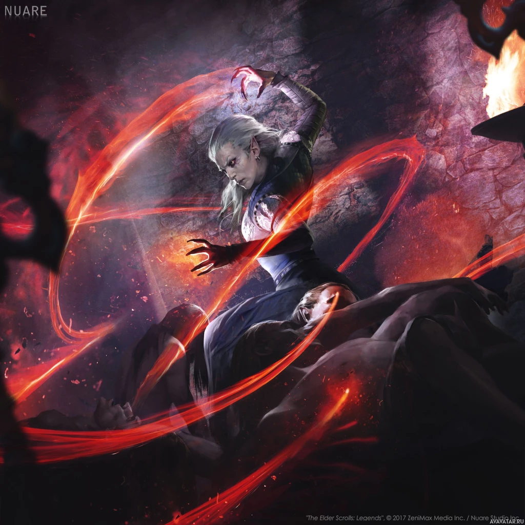 a fantasy scene with a character that appears to be a drow, which is a type of dark elf from the Dungeons & Dragons (D&D) role-playing game. This particular figure is casting a spell, as indicated by