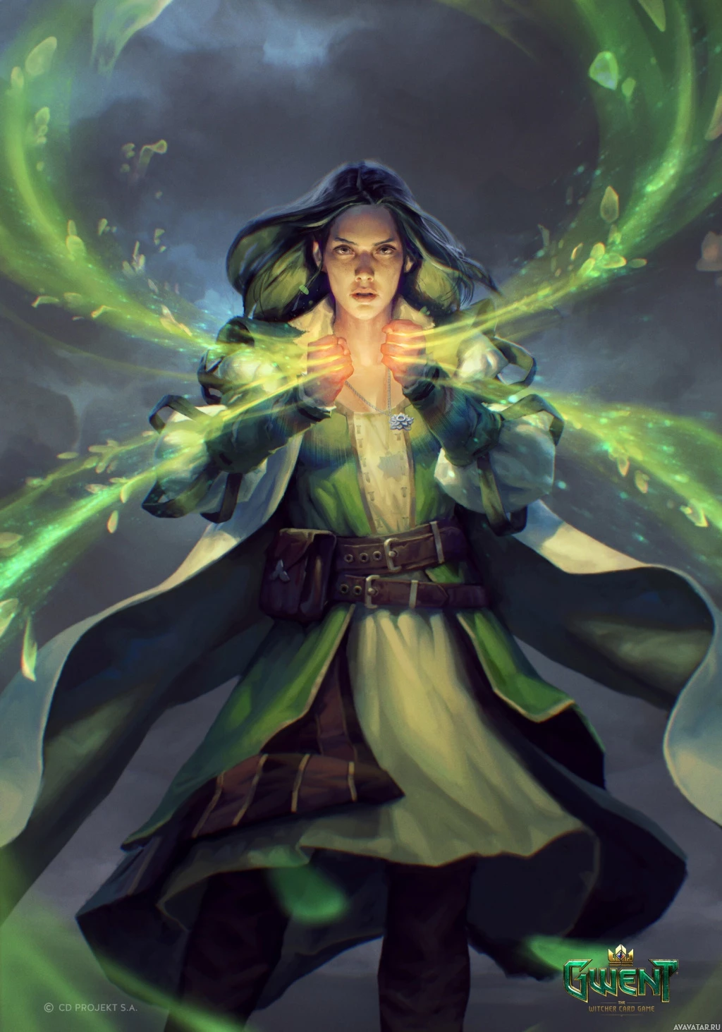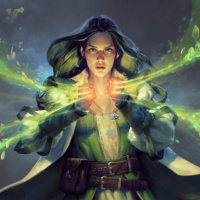 green energy or magic emanating from her hands, which are raised in the air as if she's casting a spell. Her attire includes a cape and a robe, suggesting a character of some importance or power within her narrative context. The overall atmosphere of the image is dark and moody, fitting for