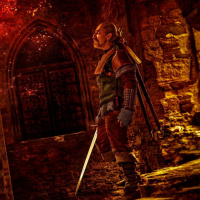 stone steps leading upwards into darkness. There's also a magical flame or energy emanating from his hand, suggesting that the character may have some