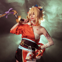 an animated character. This individual is wearing a costume consisting of a bright orange and