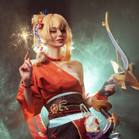cosplay attire, likely inspired by a character from an anime or video game. The individual is wearing a costume that includes elements like a kimono with