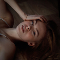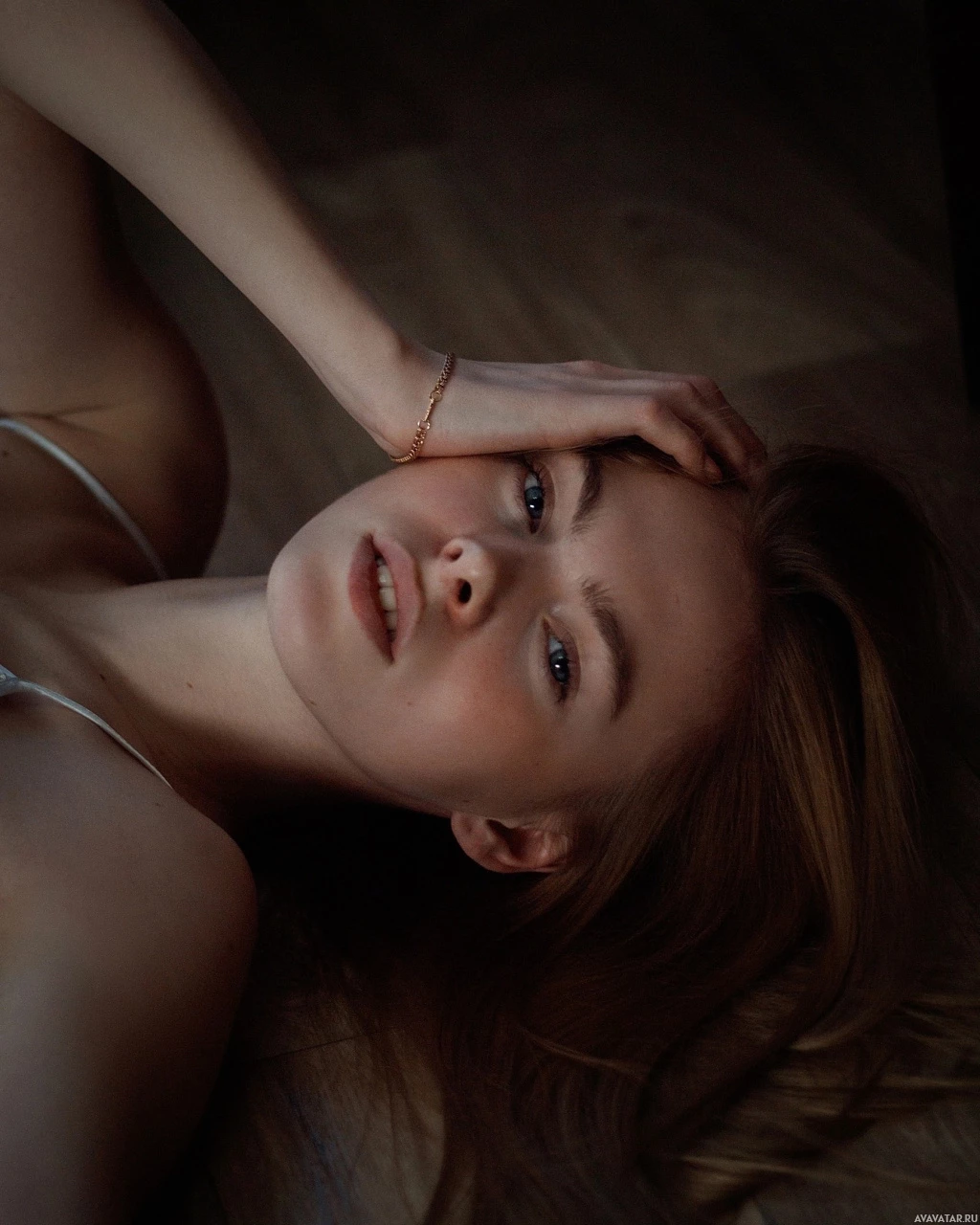 soft lighting, possibly a bedroom given the presence of what seems to be a bed beneath her. The overall style of the image is photographic, capturing an intimate and candid moment.