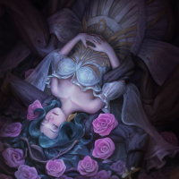 blue hair lying on her back with her eyes closed. She appears to be wearing elaborate clothing that could suggest she is portraying a character from