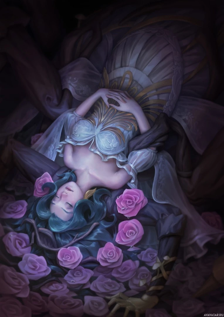 pink roses, adding a touch of romance or perhaps symbolizing love or passion in this context. The setting is dark with