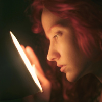 The image shows a young woman with red hair looking at an illuminated object that appears to be a lamp or flashlight. She is in close proximity to the light source, which casts a warm glow on her face and part of her upper body. It's a simple, intimate scene focused on the interaction between the individual and the light.
