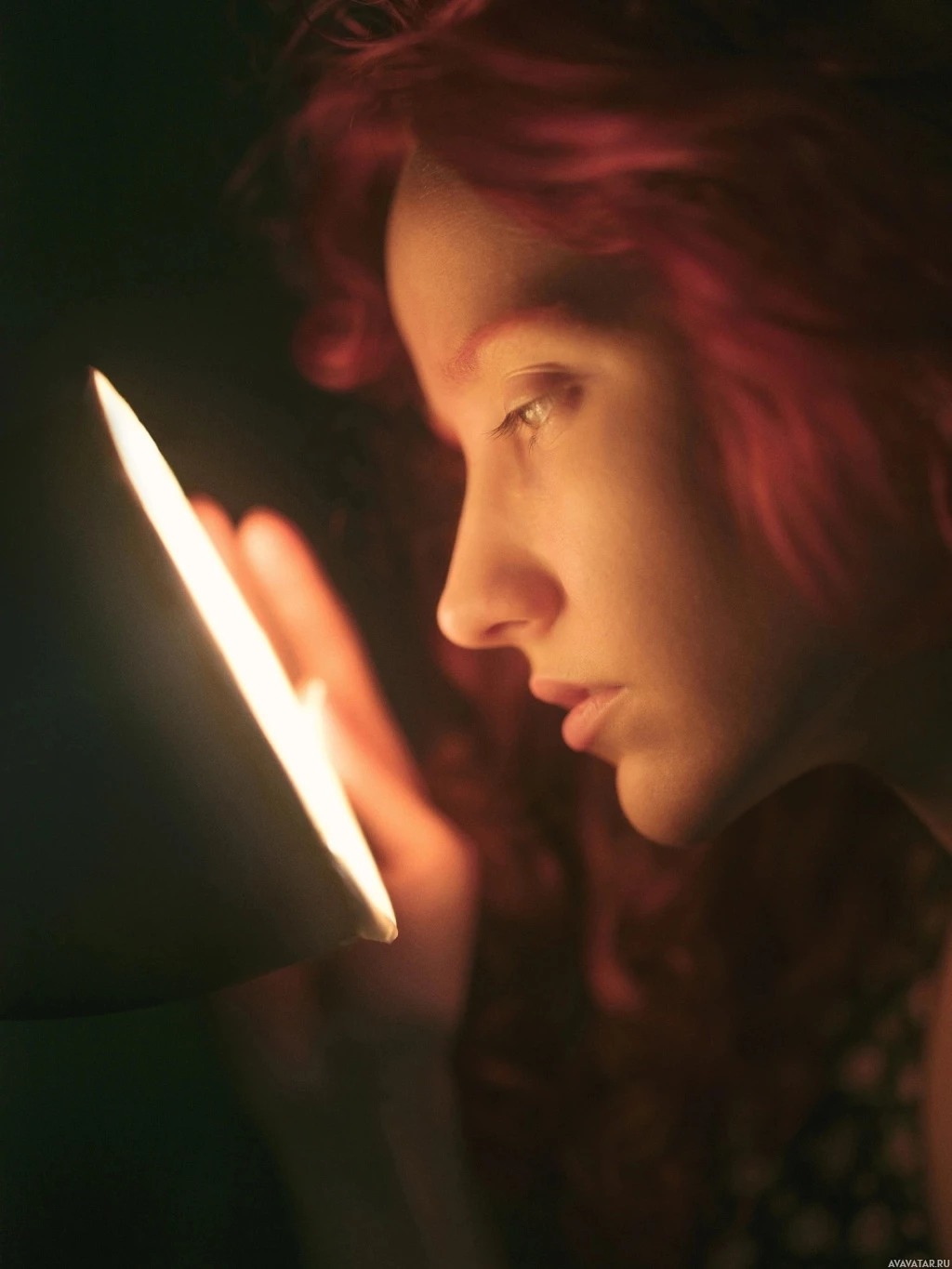 На картинке молодая рыжеволосая женщина смотрит на освещенный объект, похожий на лампу или фонарик. Она находится в непосредственной близости от источника света, который отбрасывает теплое сияние на ее лицо и верхнюю часть тела. Это простая, интимная сцена, сфокусированная на взаимодействии человека и света.