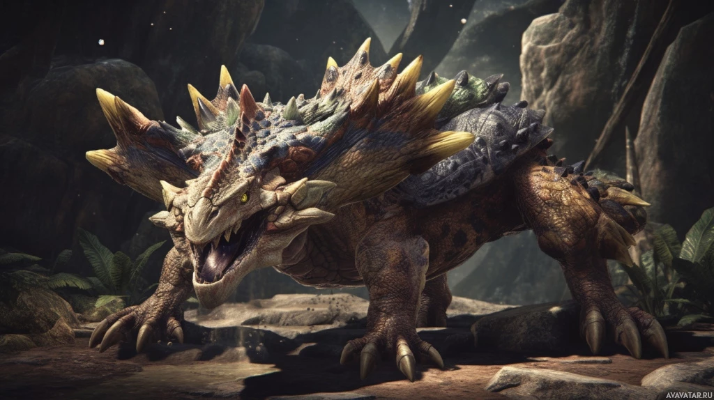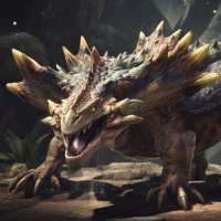 a fantasy creature, which appears to be a dragon or a mythical beast with the characteristics of both reptiles and mammals. It has the body structure and scales resembling a dinosaur, such as a Velociraptor, but with distinctive features like large wings, spikes on its head and back, and