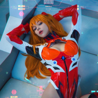 Asuka Langley from the "Neon Genesis Evangelion" series. She is wearing a red and white suit with a sleek design, typical of the female pilots' uniforms in the anime, and she has long