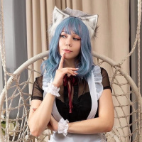blue hair, wearing an outfit that resembles maid attire. They are seated on a chair and have their hand placed thoughtfully on their chin. The setting appears to be a room with light-colored furniture and curtains, giving it