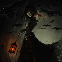 a female figure with an ethereal or mystical appearance, standing amidst a dark, gothic setting. She is holding what appears to be a lantern in her right hand, which casts