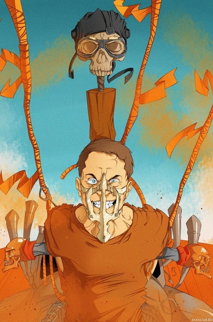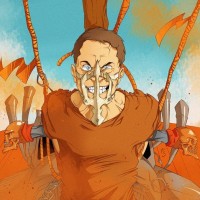 blue sky at the top, contributing to the dystopian atmosphere. The style of the illustration is dynamic and expressive, capturing the intensity and chaos often associated with the "Mad Max" series.