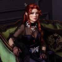 red hair and is wearing a black dress with red accents that are reminiscent of the costume worn by Red Riding Hood in the original story or various adaptations. Additionally, she has accessories such as a necklace and gloves which enhance the cosplay. The setting appears to be