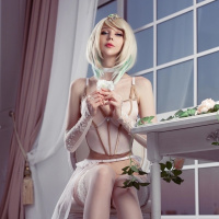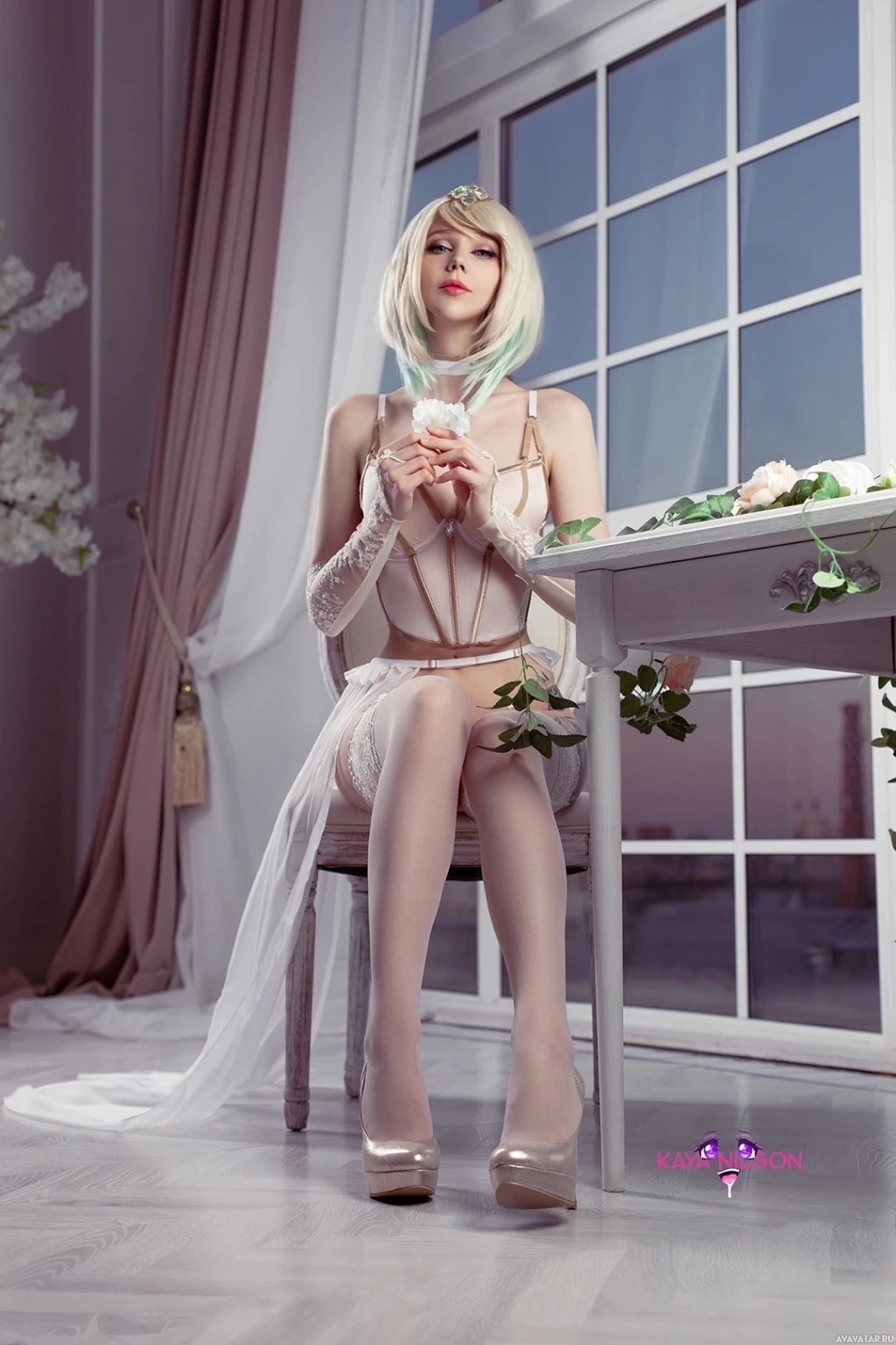 white hair sitting at a table. She is wearing lingerie and stockings, and her attire suggests she might be in a themed photoshoot or