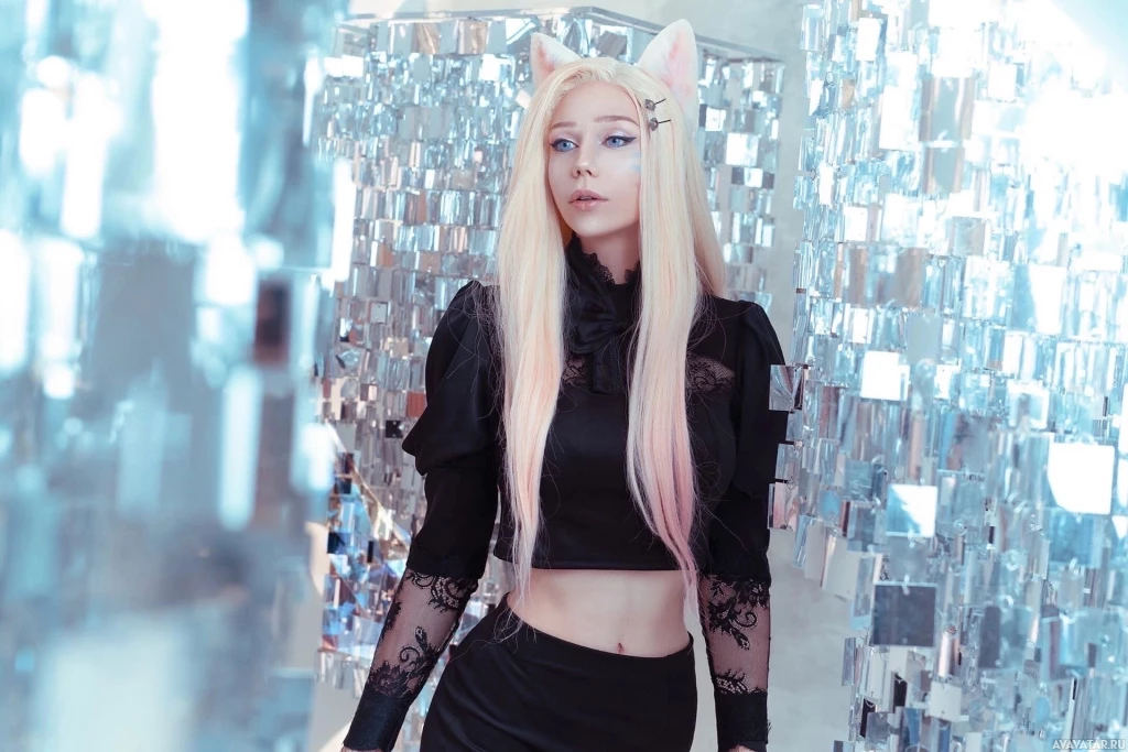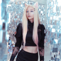 pink hair and the white ear-like accessories. The person appears to be posing in front of