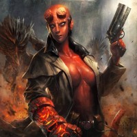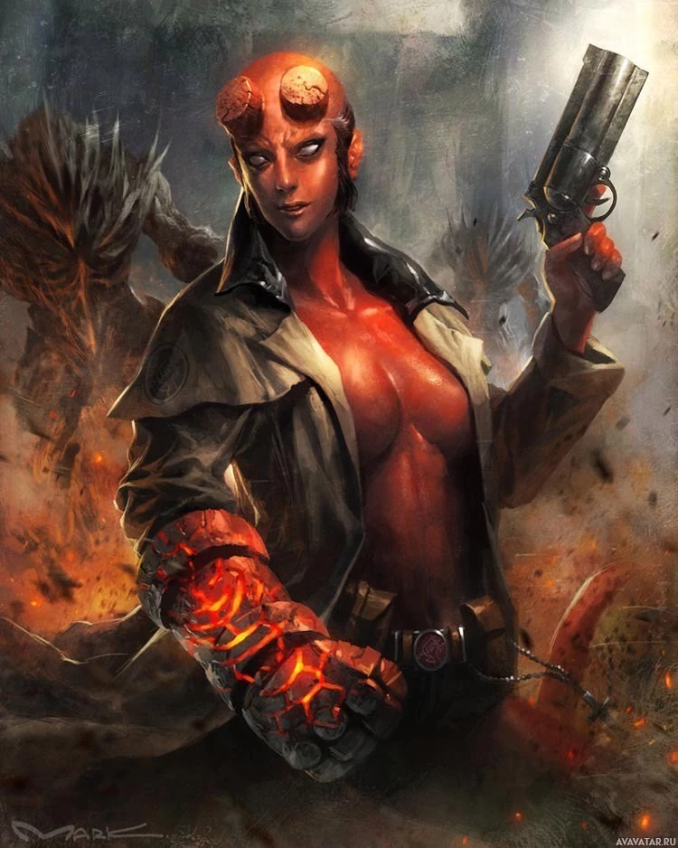 a female character with fiery skin and horns, resembling the devilish figure known as Mephistopheles or Beelzebub. She is holding a gun in her right hand, which contrasts with
