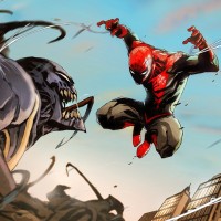 a humanoid monster or a supervillain, often referred to as Venom. On the right side of the image, there's a Spider-