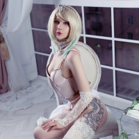the look of a character. Additionally, they have visible tattoos on their legs and are wearing stockings paired with boots. They are seated in front of a window, and there appears to be
