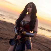 Wonder Woman, the iconic superhero character from comics and movies. The individual is standing on a beach at sunset, holding her sword crossed in front of her, which is characteristic of Wonder Woman's