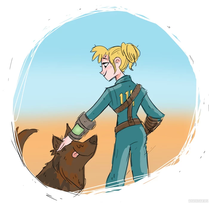 a female character from the video game "Fallout" series. She is dressed in a blue and gray