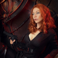a cosplay outfit resembling Black Widow from the Marvel comics and movie series. The individual is wearing a black bodysuit with