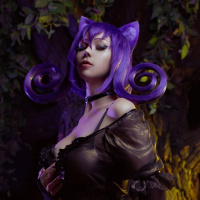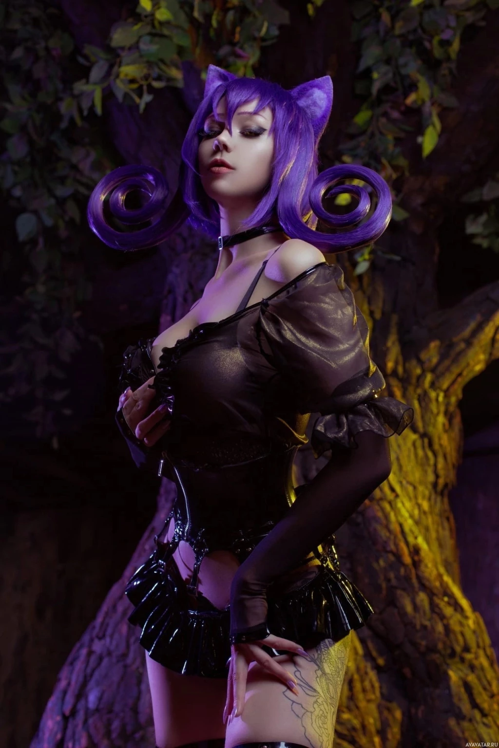 purple hair and is dressed in attire that includes elements associated with certain subcultures or characters, such as the cat ears on her head which are commonly associated with anime and manga fandoms. Her outfit and pose suggest she might be portraying a character from