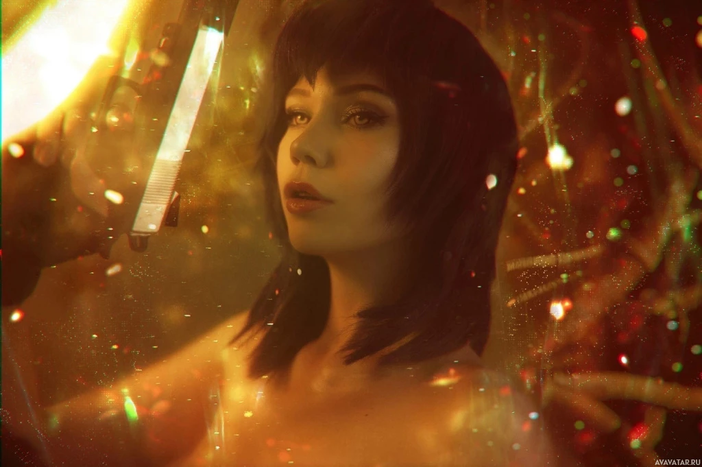 На картинке изображена женщина с темными волосами, одетая в наряд, который, по-видимому, вдохновлен тематикой косплея. В руках у нее что-то похожее на пистолет, а на лице серьезное выражение. К изображению также применены цифровые эффекты или фильтры, которые придают ему художественный или футуристический вид.