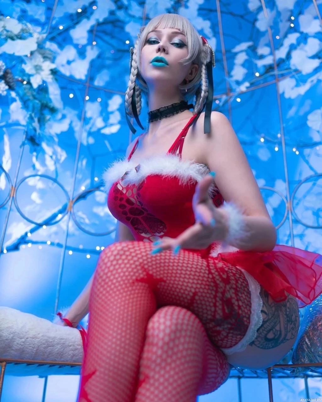 red lingerie with stockings that have a fishnet pattern, complemented by garters on the thighs. Additionally, there are accessories such as bracelets and earrings worn. The setting suggests a fantastical or dreamlike environment, possibly meant to evoke a magical or holiday theme due to the presence of what looks like