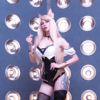 The image depicts a person dressed in cosplay attire, emulating the character Ahri from the game "