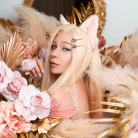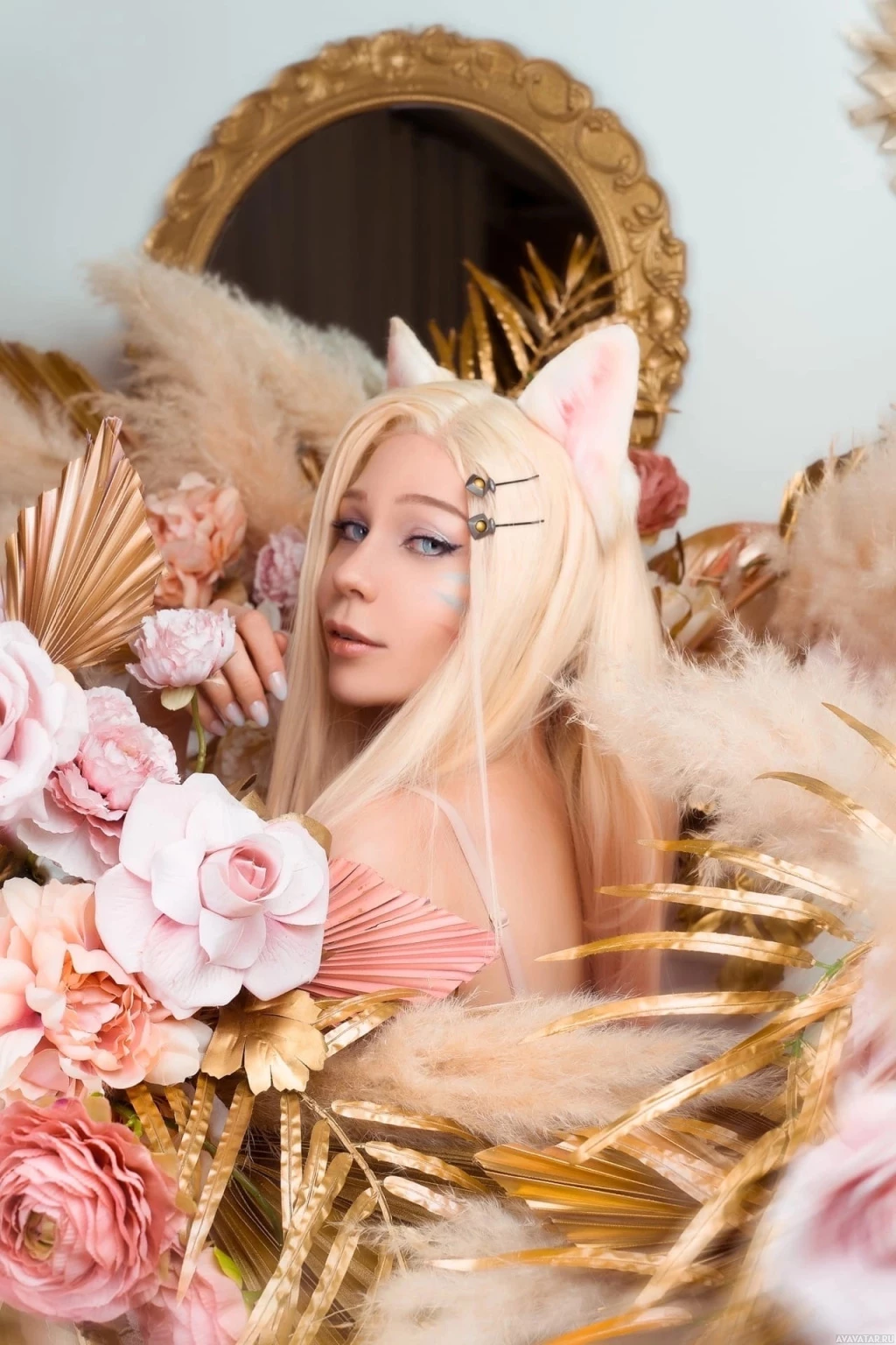 League of Legends." The character has features similar to Ahri, which include white hair and cat-like ears. The individual is surrounded by an elaborate