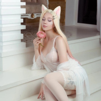 a cosplay outfit, sitting on steps. She has long