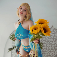 a blue outfit with white accents, resembling the character's iconic attire. Additionally, they are holding a bouquet of sunflowers, adding