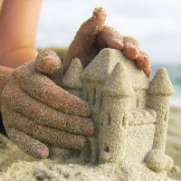 The image shows a person's hands making a sand castle on a beach. The sand is shaped into the form of a small castle with towers and walls, indicating playfulness and creativity often associated with sandcastle building at the beach.