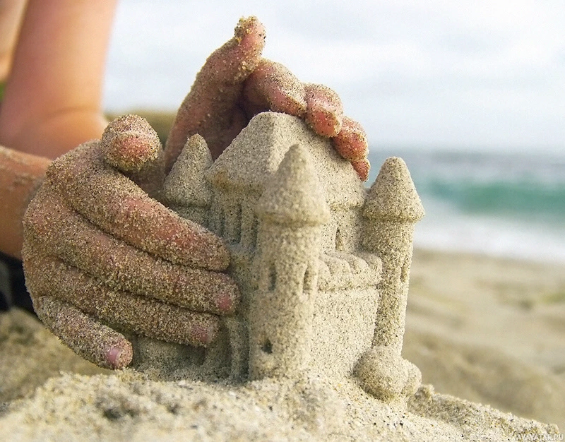 На снимке изображены руки человека, делающие песчаный замок на пляже. Песок имеет форму небольшого замка с башнями и стенами, что указывает на игривость и креативность, часто связанные со строительством замков на пляже.