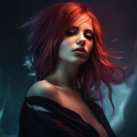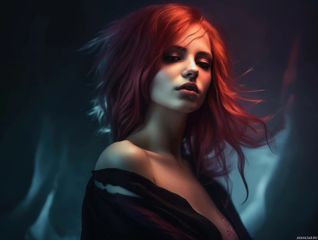 red hair. She has a contemplative or possibly melancholic expression, and the lighting gives her face a dramatic glow, likely due to artificial