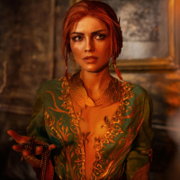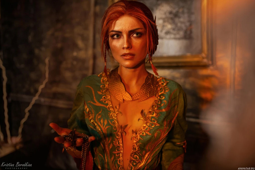 Triss Merigold, known for her role as the sorceress of Novigrad and one of the main characters in the game's storyline. She is portrayed wearing an ornate green robe with gold accents and has