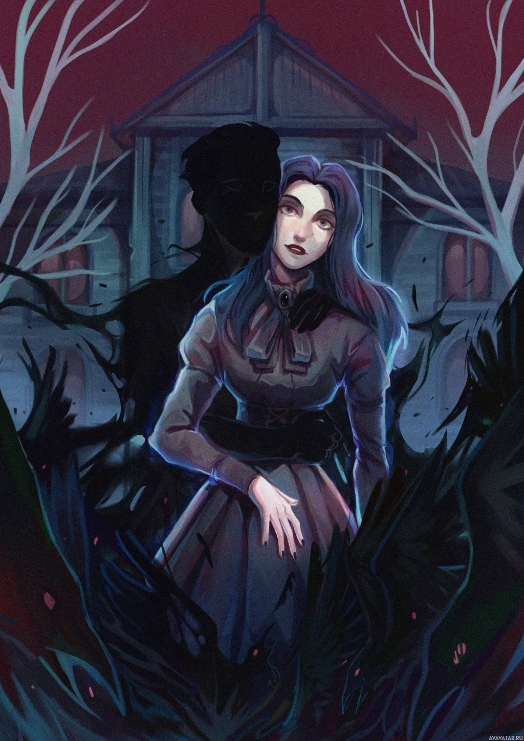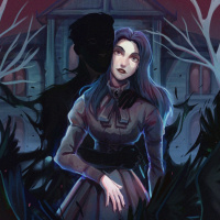 a ghostly figure of a man standing behind her, and his face is obscured by shadow or darkness. The overall atmosphere suggests a spooky or eerie scene, possibly related to a story involving the supernatural.