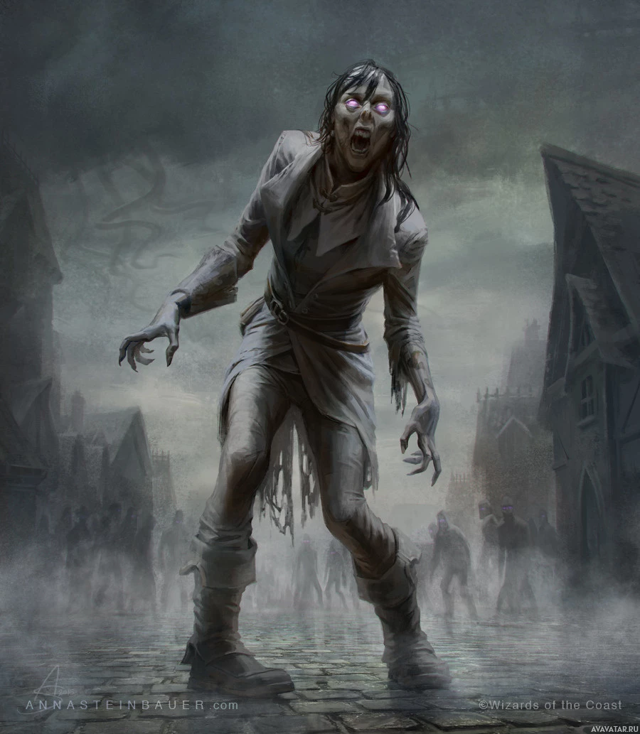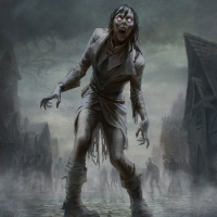 На картинке изображена сцена ужасов, в которой фигурирует фигура, похожая на зомби. Существо стоит на мокрой булыжной мостовой в темной, зловещей атмосфере. У него бледная кожа и светящиеся глаза, которые обычно ассоциируются с персонажами-нежитью или монстрами в жанрах ужасов. Кроме того, присутствует небольшой туман, добавляющий жутковатой атмосферы этой сцене.