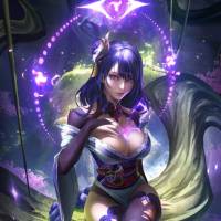 a fantastical environment, possibly a forest, given the foliage around her and the otherworldly elements in the background. She is wearing a costume that seems to blend