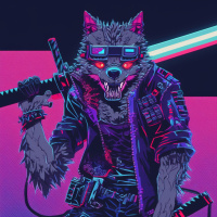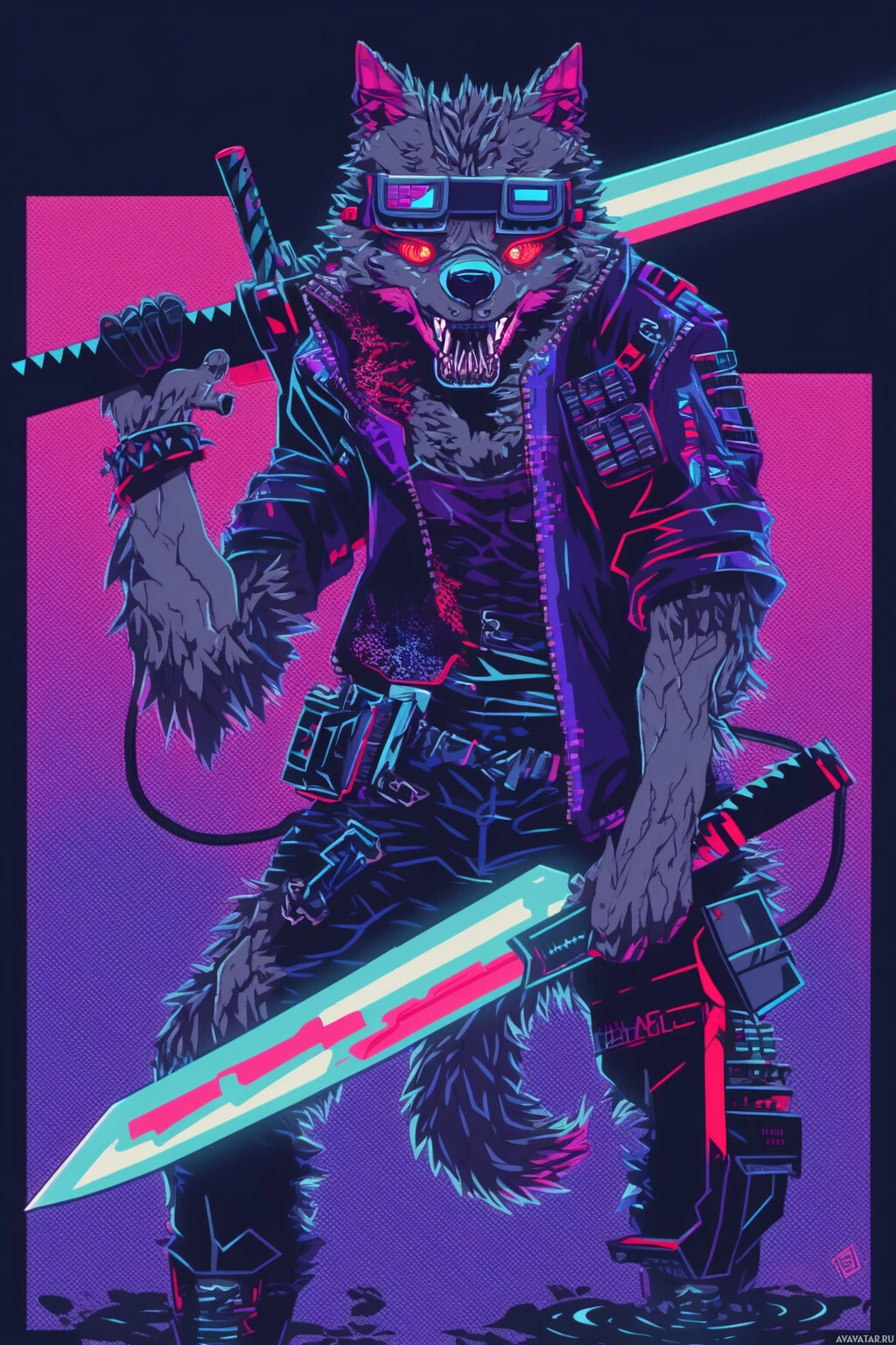 comic book-like artwork. The werewolf has the appearance of a wolf with human-like attributes such as arms and hands holding two swords crossed before it. It is wearing a dark jacket or vest over its fur, which is typical of fantasy or urban