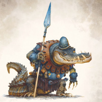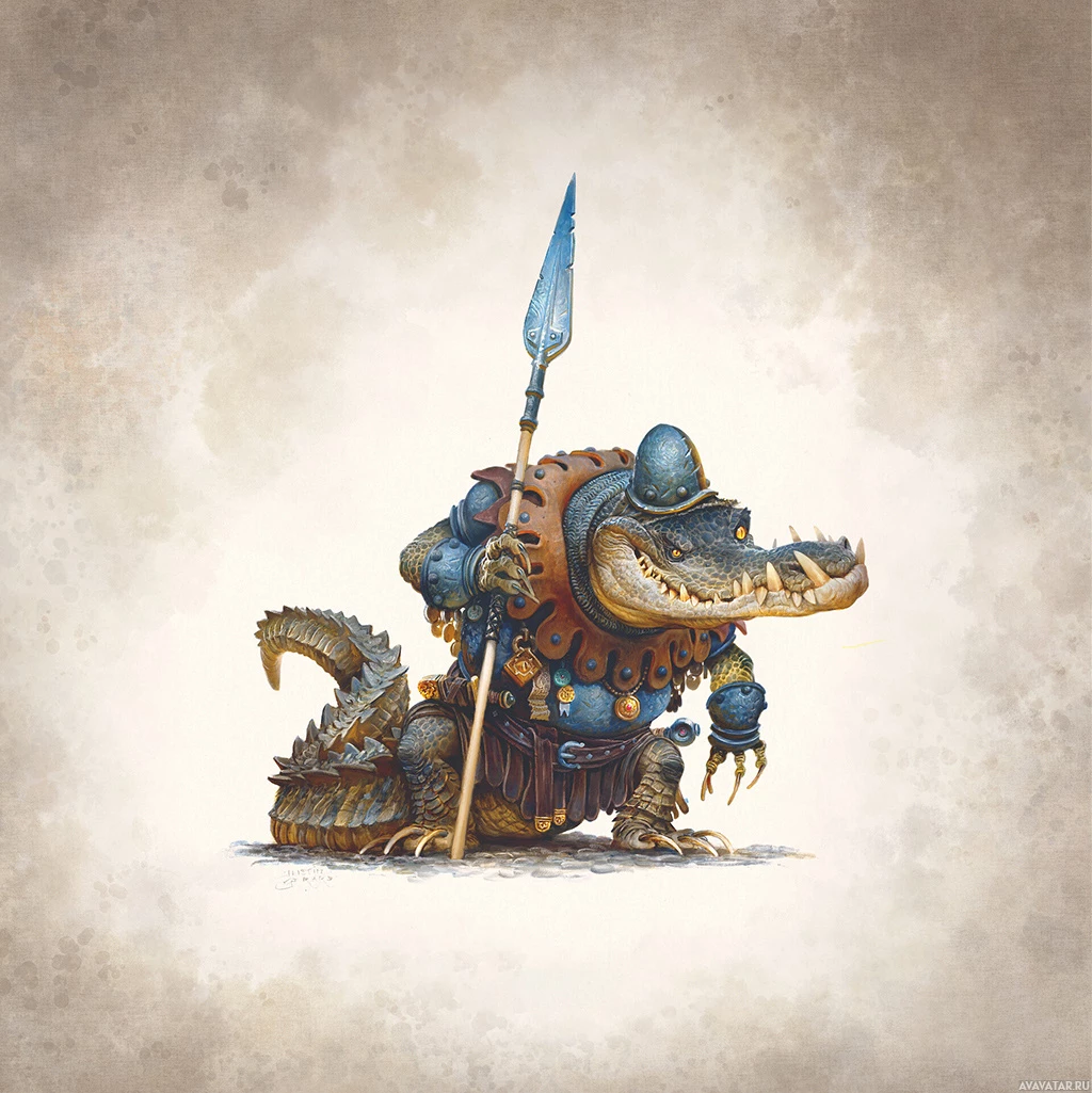 The image depicts a fantasy-themed character that appears to be a blend of a crocodile and a warrior. The creature has the head and tail of a crocodile, while its body is covered in armor reminiscent of