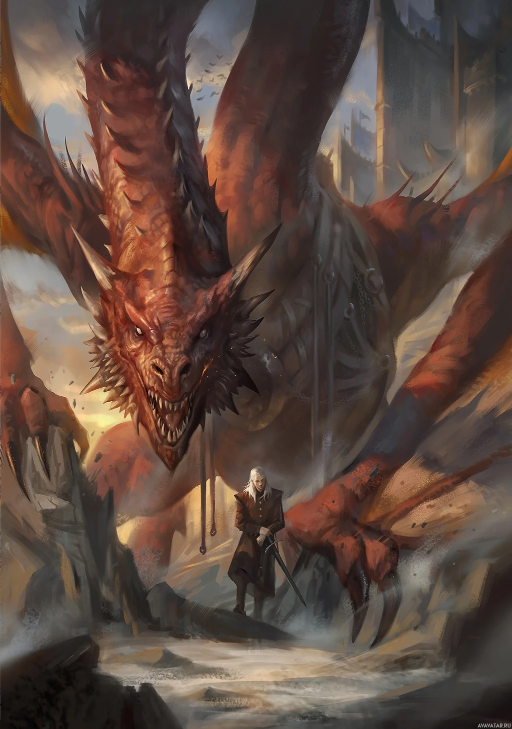 sharp teeth. The dragon is positioned in the background with