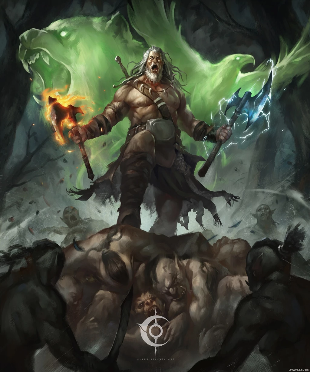 a fantasy scene with a warrior standing atop a pile of bodies, suggesting victory in battle. The warrior is holding two swords crossed over his chest and has a determined expression on his face. The background shows a dark,